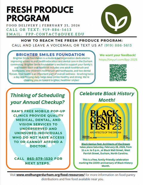 The FPP is committed to advancing research in the fields of Food is Medicine and nutrition access policy. We work to develop and maintain strong partnerships with the medical community in Durham. Research is often conducted in partnership with other local community organizations to amplify our impact and prioritize community-engaged research.